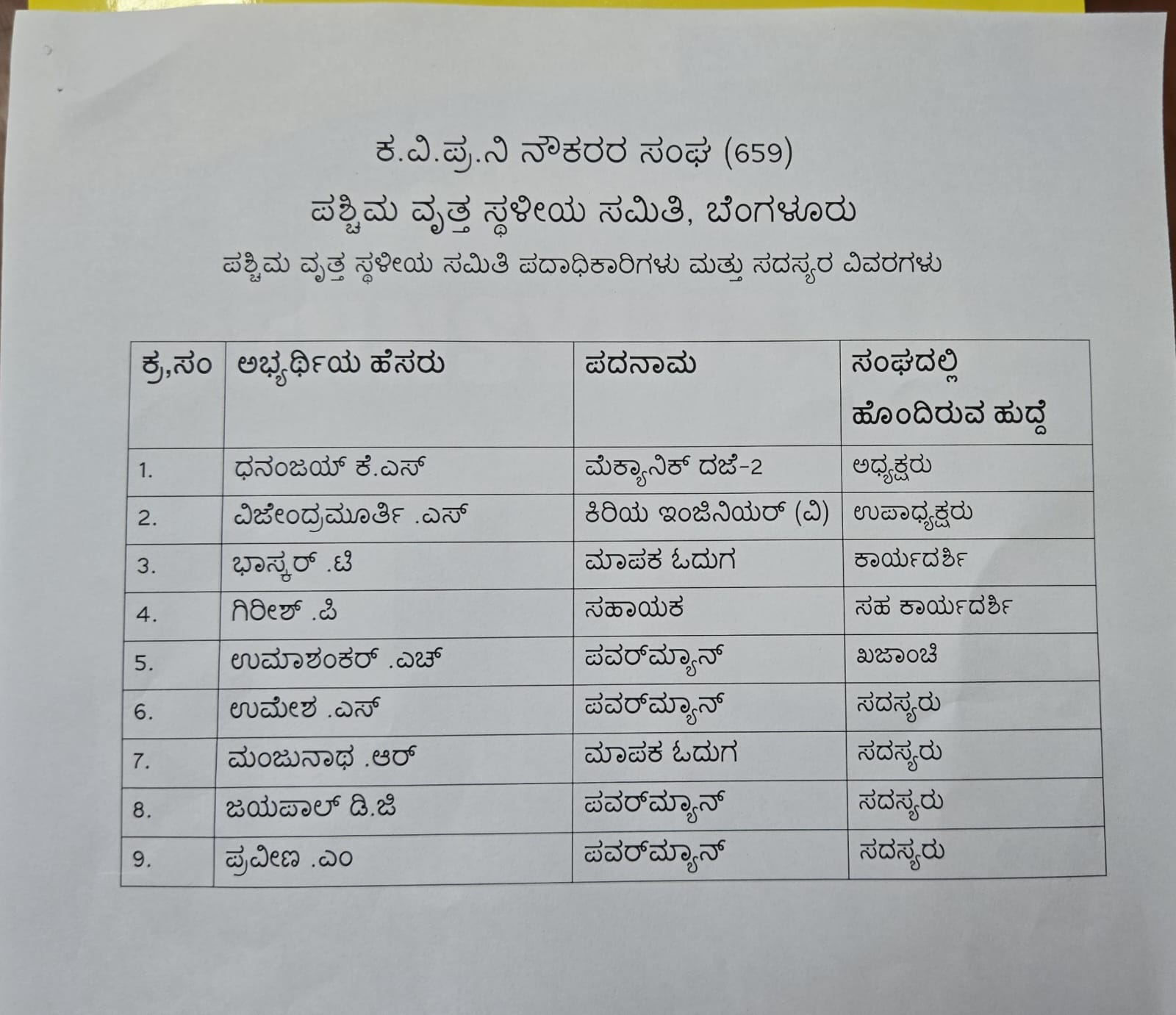 ಬೆಂಗಳೂರು: ಕಳೆದ ಬುಧವಾರ (ನ.06) ನಡೆದ ಕರ್ನಾಟಕ ವಿದ್ಯುತ್ ಪ್ರಸರಣ ನಿಗಮ ನೌಕರರ ಸಂಘದ ಪಶ್ಚಿಮ ವೃತ್ತ ಸ್ಥಳೀಯ ಸಮಿತಿ ಚುನಾವಣೆಯಲ್ಲಿ ಶ್ರೀ ಕೆ. ಬಲರಾಮ್ ಮತ್ತು ಶ್ರೀ ಶಿವರಾಂ ಅವರ ತಂಡ ಅದ್ಭುತ ಗೆಲುವು ದಾಖಲಿಸಿದೆ.
