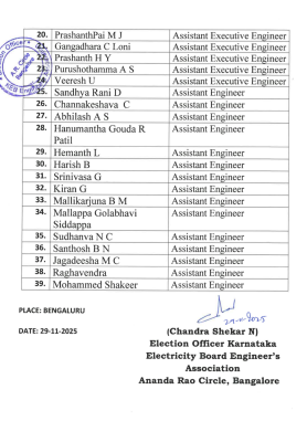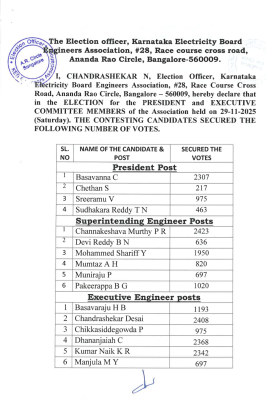 Greater Bengaluru News9 : ಶನಿವಾರ (ನ.29) ನಡೆದ ಕರ್ನಾಟಕ ವಿದ್ಯುಚ್ಛಕ್ತಿ ಮಂಡಳಿ ಇಂಜಿನಿಯರುಗಳ ಸಂಘದ ( KEBEA ) ಚುನಾವಣೆಯಲ್ಲಿ ಇಂಜಿನಿಯರ್​ ಬಸವಣ್ಣ. ಸಿ ಮತ್ತು ಅವರ ತಂಡ ಭರ್ಜರಿ ಜಯಭೇರಿ ಬಾರಿಸಿತು. ಬಸವಣ್ಣನವರ ಆರ್ಭಟ ಎಷ್ಟಿತ್ತೆಂದರೆ ಎದುರಾಳಿ ತಂಡದವರು ಅಕ್ಷರಶಃ ಧೂಳಿಪಟವಾದರು. ಒಂದಲ್ಲ ಎರಡಲ್ಲ ಸಾವಿರಾರು ಮತಗಳ ಅಂತರದಿಂದ ಭರ್ಜರಿ ಗೆಲುವಿನೊಂದಿಗೆ ಬಸವಣ್ಣ ಅವರು ಅಧ್ಯಕ್ಷ ಸ್ಥಾನಕ್ಕೇರಿದರು. ಇನ್ನೇನಿದ್ದರು KEBEA ಅಲ್ಲಿ ಬಸವಣ್ಣರ ಯುಗ ಆರಂಭವಾಗಿದೆ.