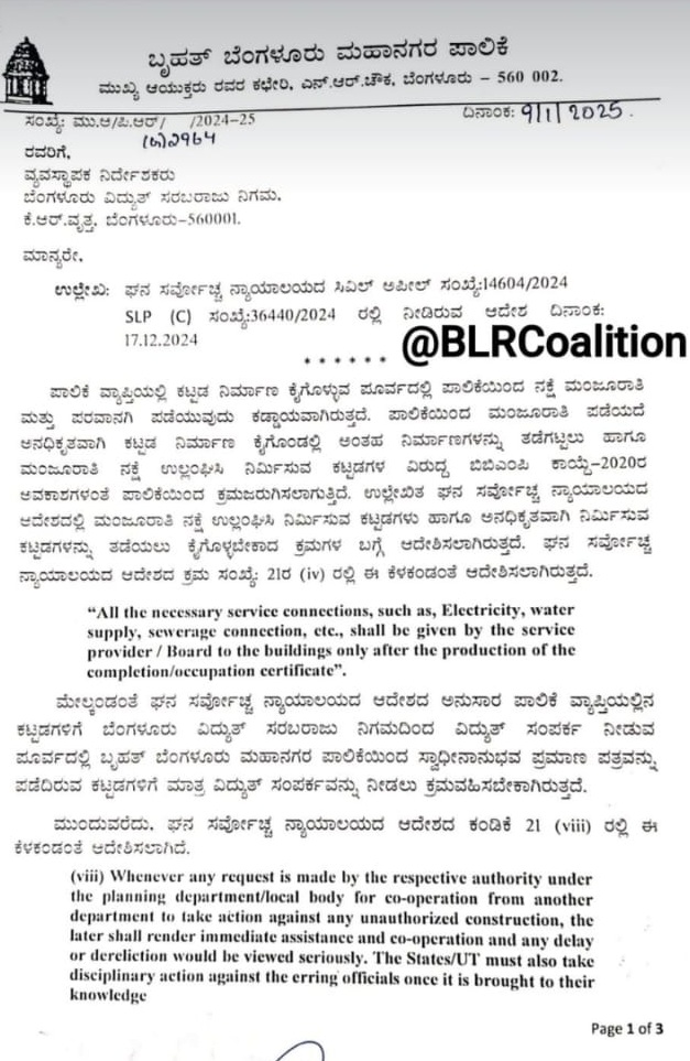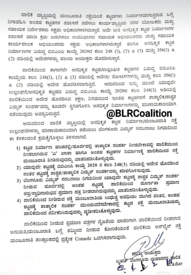 ಈ ಕುರಿತು ವಿದ್ಯುತ್ ಸರಬರಾಜು ನಿಗಮದ ವ್ಯವಸ್ಥಾಪಕ ನಿರ್ದೇಶಕರಿಗೆ ಪತ್ರ ಬರೆದಿರುವ ಬಿಬಿಎಂಪಿ ಮುಖ್ಯ ಆಯುಕ್ತರು, ಪಾಲಿಕೆ ವ್ಯಾಪ್ತಿಯಲ್ಲಿ ಕಟ್ಟಡ ನಿರ್ಮಾಣ ಕೈಗೊಳ್ಳುವ ಪೂರ್ವದಲ್ಲಿ ಪಾಲಿಕೆಯಿಂದ ನಕ್ಷೆ ಮಂಜೂರಾತಿ ಮತ್ತು ಪರವಾನಗಿ ಪಡೆಯುವುದು ಕಡ್ಡಾಯವಾಗಿರುತ್ತದೆ. ಪಾಲಿಕೆಯಿಂದ ಮಂಜೂರಾತಿ ಪಡೆಯದೆ ಆನಧಿಕೃತವಾಗಿ ಕಟ್ಟಡ ನಿರ್ಮಾಣ ಕೈಗೊಂಡಲ್ಲಿ ಅಂತಹ ನಿರ್ಮಾಣಗಳನ್ನು ತಡೆಗಟ್ಟಲು ಹಾಗೂ ಮಂಜೂರಾತಿ ನಕ್ಷೆ ಉಲ್ಲಂಘಿಸಿ ನಿರ್ಮಿಸುವ ಕಟ್ಟಡಗಳ ವಿರುದ್ಧ ಬಿಬಿಎಂಪಿ ಕಾಯ್ದೆ-2020ರ ಅವಕಾಶಗಳಂತೆ ಪಾಲಿಕೆಯಿಂದ ಕ್ರಮಜರುಗಿಸಲಾಗುತ್ತಿದೆ. ಉಲ್ಲೇಖಿತ ಸುಪ್ರೀಂಕೋರ್ಟ್ ಆದೇಶದಲ್ಲಿ ಮಂಜೂರಾತಿ ನಕ್ಷೆ ಉಲ್ಲಂಘಿಸಿ ನಿರ್ಮಿಸುವ ಕಟ್ಟಡಗಳು ಹಾಗೂ ಅನಧಿಕೃತವಾಗಿ ನಿರ್ಮಿಸುವ ಕಟ್ಟಡಗಳನ್ನು ತಡೆಯಲು ಕೈಗೊಳ್ಳಬೇಕಾದ ಕ್ರಮಗಳ ಬಗ್ಗೆ ಆದೇಶಿಸಲಾಗಿದೆ.