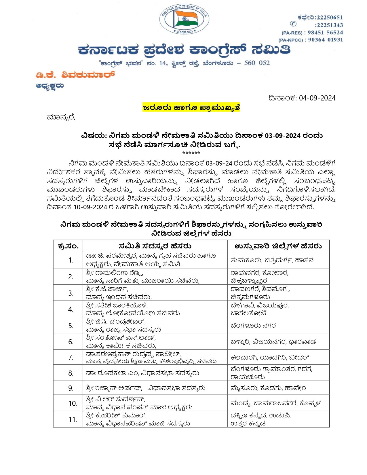 ನಿಗಮ ಮಂಡಳಿ ನೇಮಕಾತಿ ಸಮಿತಿಯು ದಿನಾಂಕ 03-09-24 ರಂದು ಸಭೆ ನಡೆಸಿ, ನಿಗಮ ಮಂಡಳಿಗೆ ನಿರ್ದೇಶಕರ ಸ್ಥಾನಕ್ಕೆ ನೇಮಿಸಲು ಹೆಸರುಗಳನ್ನು ಶಿಫಾರಸ್ಸು ಮಾಡಲು ನೇಮಕಾತಿ ಸಮಿತಿಯ ಎಲ್ಲಾ ಸದಸ್ಯರುಗಳಿಗೆ ಜಿಲ್ಲೆಗಳ ಉಸ್ತುವಾರಿಯನ್ನು ನೀಡಲಾಗಿದೆ ಹಾಗೂ ಜಿಲ್ಲೆಗಳಲ್ಲಿ ಸಂಬಂಧಪಟ್ಟ ಮುಖಂಡರುಗಳು ಶಿಫಾರಸ್ಸು ಮಾಡಬೇಕಾದ ಸದಸ್ಯರುಗಳ ಸಂಖ್ಯೆಯನ್ನು ನಿಗದಿಗೊಳಿಸಲಾಗಿದೆ. ಸಮಿತಿಯಲ್ಲಿ ತೆಗೆದುಕೊಂಡ ತೀರ್ಮಾನದಂತೆ ಸಂಬಂಧಪಟ್ಟ ಮುಖಂಡರುಗಳು ತಮ್ಮ ಶಿಫಾರಸ್ಸುಗಳನ್ನು ದಿನಾಂಕ 10-09-2024 ರ ಒಳಗಾಗಿ ಉಸ್ತುವಾರಿ ಸಮಿತಿಯ ಸದಸ್ಯರುಗಳಿಗೆ ಸಲ್ಲಿಸಲು ಕೋರಲಾಗಿದೆ.