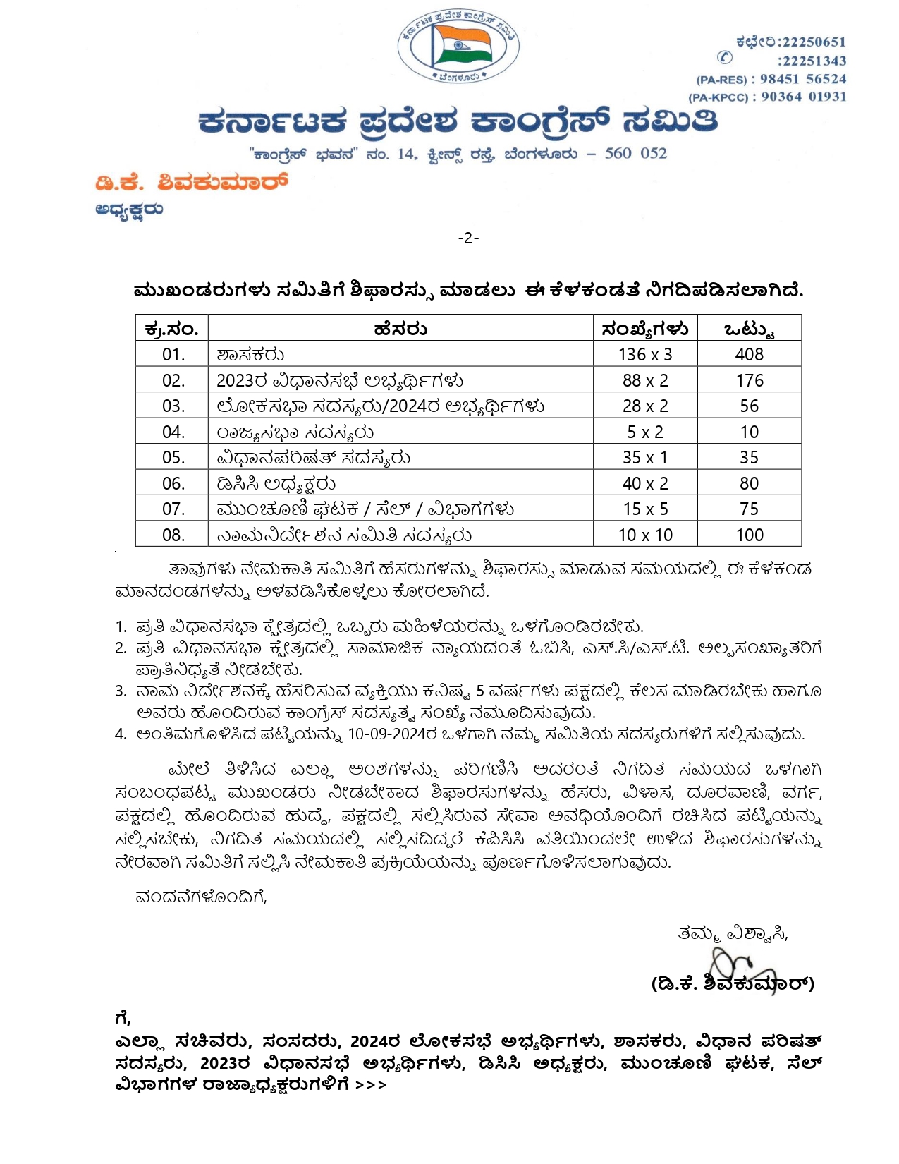 ಪಕ್ಷದ ಜಿಲ್ಲಾ ಘಟಕಗಳ ಅಧ್ಯಕ್ಷರು, ಪಕ್ಷದ ಶಾಸಕರು, ವಿಧಾನಸಭೆ ಚುನಾವಣೆಯಲ್ಲಿ ಸ್ಪರ್ಧಿಸಿದ್ದ ಪಕ್ಷದ ಅಭ್ಯರ್ಥಿಗಳು, ಸಂಸದರು ಮಾಜಿ ಸಂಸದರು, ಪ್ರಮುಖರು ಸೇರಿ ಹೆಸರುಗಳನ್ನು ಶಿಫಾರಸು ಮಾಡಲು ಸೂಚಿಸಲಾಗಿದೆ. ಅಲ್ಲದೆ, ಆಯ್ಕೆ ಸಮಿತಿಯಲ್ಲಿರುವ ಸದಸ್ಯರಿಗೆ ಮೂರು ಜಿಲ್ಲೆಗಳ ಉಸ್ತುವಾರಿ ನೀಡಲಾಗಿದೆ.