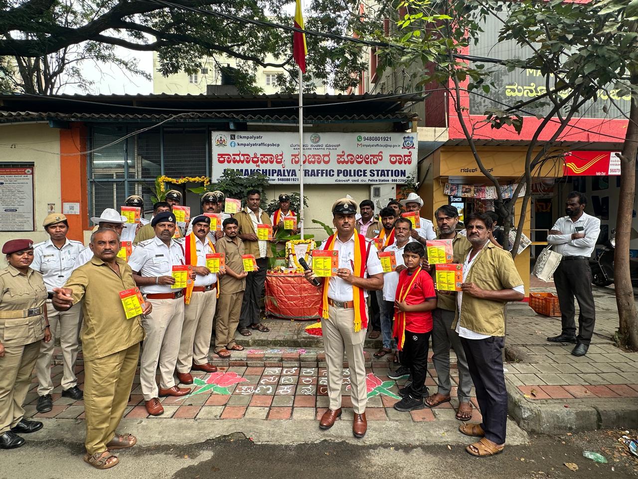 ಬೆಂಗಳೂರು: ರಾಜ್ಯದೆಲ್ಲೆಡೆ ಕನ್ನಡ ರಾಜ್ಯೋತ್ಸವ ಸಂಭ್ರಮ ಮನೆ ಮಾಡಿದೆ. ಇದೇ ಸಂದರ್ಭದಲ್ಲಿ ಬೆಂಗಳೂರಿನ ಕಾಮಾಕ್ಷಿಪಾಳ್ಯ ಸಂಚಾರ ಪೊಲೀಸ್ ಠಾಣೆಯ ಸಿಬ್ಬಂದಿ ವಿನೂತನ ಕಾರ್ಯವನ್ನು ಕೈಗೊಂಡಿದ್ದು, ಜನರ ಮೆಚ್ಚುಗೆಯನ್ನು ಪಡೆದುಕೊಂಡಿದೆ.