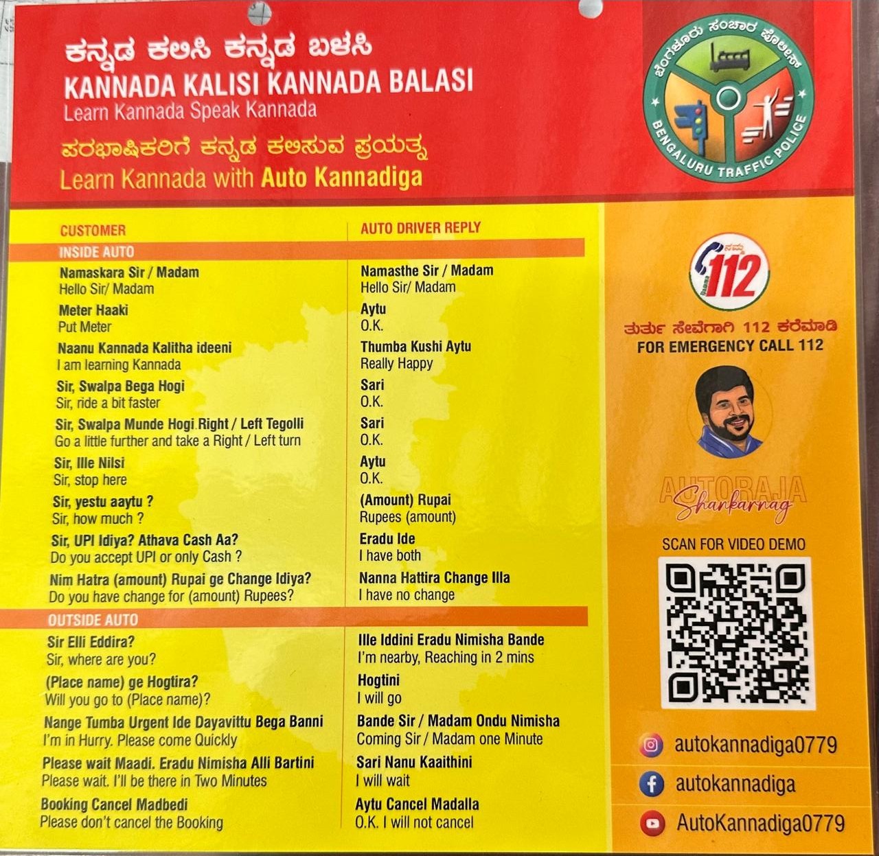 ಕಾಮಾಕ್ಷಿಪಾಳ್ಯ ಸಂಚಾರ ಪೊಲೀಸ್ ಠಾಣೆಯ ಪ್ರತಿ ಆಟೋಗಳಿಗೆ ಫಲಕಗಳನ್ನು ಅಳವಡಿಸಲಾಗುತ್ತಿದೆ. ಈ ಅಭಿಯಾನವನ್ನು ಇನ್ಸ್ಪೆಕ್ಟರ್ ಯೋಗೇಶ್ ಎಸ್. ಟಿ. ನೇತೃತ್ವದಲ್ಲಿ ನಡೆಸಲಾಗುತ್ತಿದೆ. ಭಾಷೆ ಗೊತ್ತಿಲ್ಲದೆ ಪ್ರಯಾಣಿಕರು ಮತ್ತು ಆಟೋ ಚಾಲಕರ ನಡುವೆ ಕೆಲವೊಂದು ಗಲಾಟೆಗಳು ಆಗುತ್ತಿದ್ದು, ಇಂಥದ್ದನ್ನು ತಪ್ಪಿಸಲು ಮತ್ತು ಕರ್ನಾಟಕದಲ್ಲಿ ನೆಲೆಸಿರುವ ಅನ್ಯಭಾಷಿಕರಿಗೆ ಕನ್ನಡ ಕಲಿತುಕೊಳ್ಳಿ ಎಂದು ಹೇಳಲು ಇಂಥದ್ದೊಂದು ವಿನೂತನ ಪ್ರಯತ್ನವನ್ನು ಕಾಮಾಕ್ಷಿಪಾಳ್ಯ ಸಂಚಾರ ಠಾಣಾ ಪೊಲೀಸರು ಮಾಡುತ್ತಿದ್ದಾರೆ.