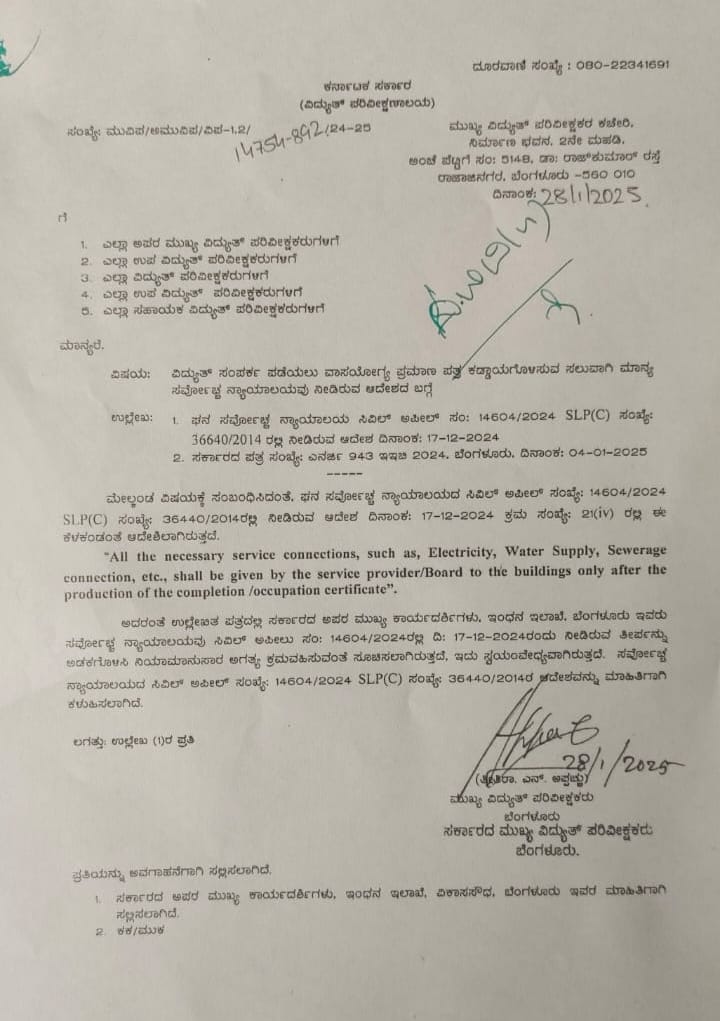 ಅದರಂತೆ ಉಲ್ಲೇಖಿತ ಪತ್ರದಲ್ಲಿ ಸರ್ಕಾರದ ಅಪರ ಮುಖ್ಯ ಕಾರ್ಯದರ್ಶಿಗಳು, ಇಂಧನ ಇಲಾಖೆ, ಬೆಂಗಳೂರು ಇವರು ಸರ್ವೋಚ್ಚ ನ್ಯಾಯಾಲಯವು ಸಿವಿಲ್ ಅಪೀಲು ಸಂ: 14604/2024ರಲ್ಲಿ ದಿ: 17-12-2024ರಂದು ನೀಡಿರುವ ತೀರ್ಪನ್ನು ಅಡಕಗೊಳಸಿ ನಿಯಾಮಾನುಸಾರ ಅಗತ್ಯ ಕ್ರಮವಹಿಸುವಂತೆ ಸೂಚಿಸಲಾಗಿದೆ.
