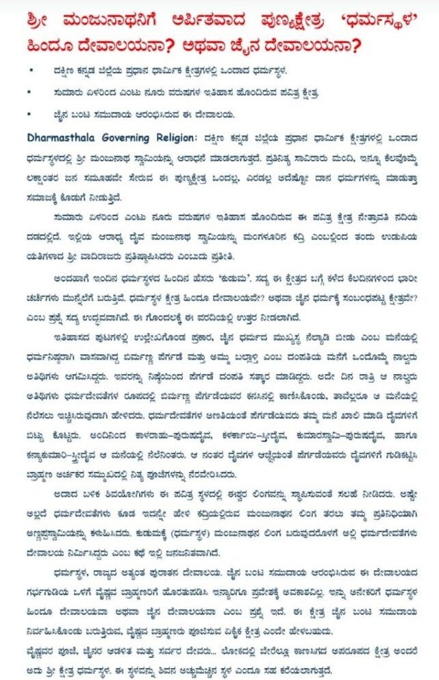 ಬೆಂಗಳೂರು: ಶ್ರೀ ಮಂಜುನಾಥನಿಗೆ ಅರ್ಪಿತವಾದ ಪುಣ್ಯಕ್ಷೇತ್ರ ಧರ್ಮಸ್ಥಳ ಹಿಂದೂ ದೇವಾಲಯನಾ? ಅಥವಾ ಜೈನ ದೇವಾಲಯನಾ? ಎನ್ನುವ ಬಗ್ಗೆ ಸಾಮಾಜಿಕ ಜಾಲತಾಣದಲ್ಲಿ ವೈರಲ್ ಪೋಟೋ ಒಂದು ಹರಿದಾಡುತ್ತಿದೆ. ಅದರಲ್ಲಿ ಏನಿದೆ ಎನ್ನುಬ ಬಗ್ಗೆ ಮುಂದೆ ಓದಿ.
