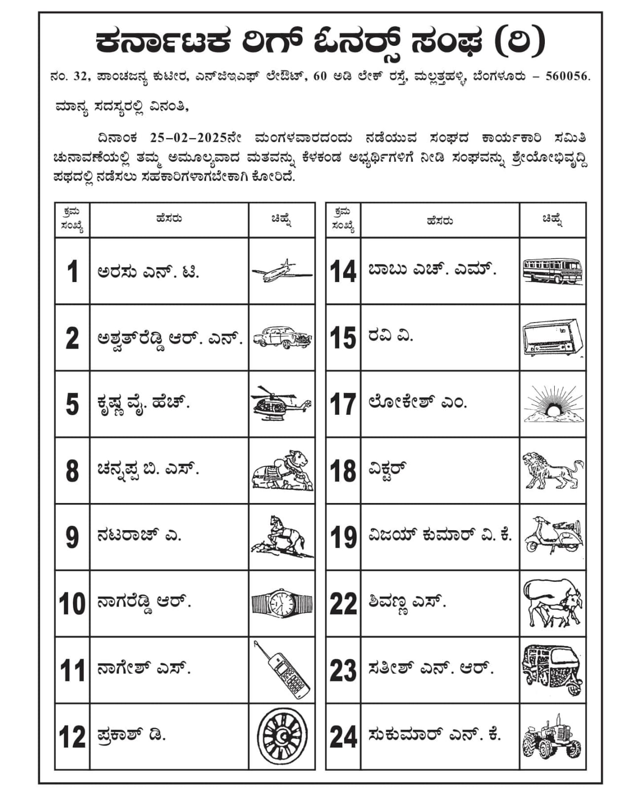 ಬೆಂಗಳೂರು: ಇದೇ ಮಂಗಳವಾರ (ಫೆ.25) ಕರ್ನಾಟಕ ರಿಗ್ ಓನರ್ಸ್ ಸಂಘದ ಕಾರ್ಯಕಾರಿ ಸಮಿತಿ ಚುನಾವಣೆ ನಡೆಯಲಿದ್ದು, ದಿಶಾ ಸಮಿತಿ ಸದಸ್ಯರಾದ ಎಸ್. ಶಿವಣ್ಣ ಹಾಗೂ ಅವರ ತಂಡಕ್ಕೆ ನಿಮ್ಮ ಅಮೂಲ್ಯವಾದ ಮತವನ್ನು ನೀಡಿ ಜಯಶಾಲಿಯನ್ನಾಗಿ ಮಾಡಬೇಕೆಂದು ಕೋರಲಾಗಿದೆ.
