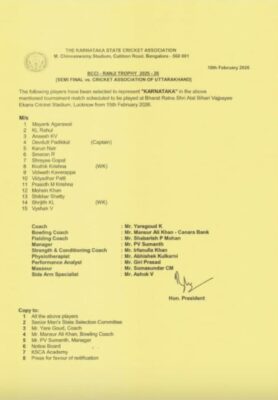 Greater Bengaluru News9 : 2025-26ರ ರಣಜಿ ಟ್ರೋಫಿ ಕ್ವಾರ್ಟರ್ಫೈನಲ್ನಲ್ಲಿ ಬಲಿಷ್ಠ ಮುಂಬೈ ತಂಡವನ್ನು ಮಣಿಸಿರುವ ಕರ್ನಾಟಕ ತಂಡವು ಭರ್ಜರಿಯಾಗಿ ಸೆಮಿಫೈನಲ್ ಪ್ರವೇಶಿಸಿದೆ. ಫೆಬ್ರವರಿ 15ರಿಂದ ಬೆಂಗಳೂರಿನಲ್ಲಿ ನಡೆಯಲಿರುವ ಸೆಮಿಫೈನಲ್ ಪಂದ್ಯದಲ್ಲಿ ಕರ್ನಾಟಕ ತಂಡವು ಉತ್ತರಾಖಂಡ ತಂಡವನ್ನು ಎದುರಿಸಲಿದೆ.