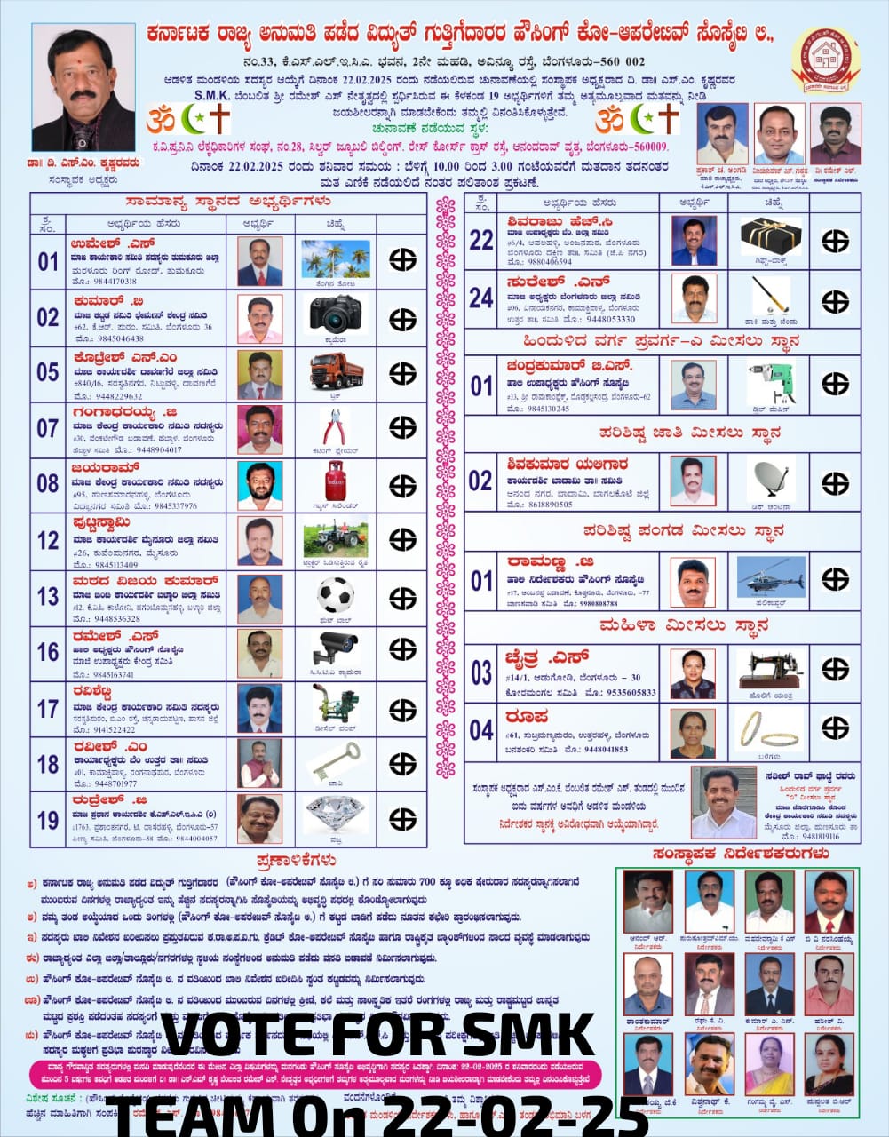 ದಿನಾಂಕ 22/02/2025 ರ ಶನಿವಾರದಂದು ಚುನಾವಣೆ ನಡೆಯಿತು. SMK ತಂಡ ಅಭೂತಪೂರ್ವ ವಿಜಯ ಸಾಧಿಸಿದ್ದು, ಇದಕ್ಕೆ ಕಾರಣಿಭೂತರಾದ ಎಸ್ಎಂಕೆ ತಂಡದ ಅಭಿಮಾನಿಗಳಿಗೆ/ಕಾರ್ಯಕರ್ತರಿಗೆ ಹಾಗೂ ನಾಯಕರುಗಳಿಗೆ ಕರ್ನಾಟಕ ರಾಜ್ಯ ಅನುಮತಿ ಪಡೆದ ವಿದ್ಯುತ್ ಗುತ್ತಿಗೆದಾರ ಸಂಘದ ಮಾಜಿ ಉಪಾಧ್ಯಕ್ಷ ರಮೇಶ್ ಎಸ್ ಅವರು ಧನ್ಯವಾದ ಸಲ್ಲಿಸಿದ್ದಾರೆ.