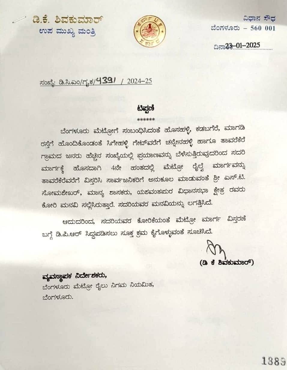 ಸೋಮಶೇಖರ್ ಅವರ ಕೋರಿಕೆಯಂತೆ ಮೆಟ್ರೋ ಮಾರ್ಗ ವಿಸ್ತರಣೆ ಬಗ್ಗೆ ಡಿ.ಪಿ.ಆರ್ ಸಿದ್ಧಪಡಿಸಲು ಸೂಕ್ತ ಕ್ರಮ ಕೈಗೊಳ್ಳುವಂತೆ ಸೂಚಿಸಲಾಗಿದೆ ಎಂದು ಡಿಸಿಎಂ ಡಿಕೆ ಶಿವಕುಮಾರ್ ಅವರು ಪತ್ರಿಕಾ ಪ್ರಕಟಣೆ ಹೊರಡಿಸಿದ್ದಾರೆ.