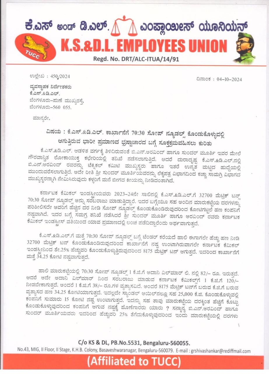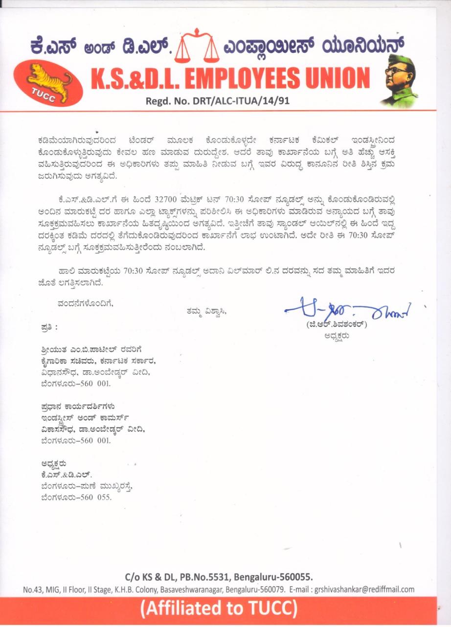 ಕೆಎಸ್ಡಿಎಲ್ ಅಧಿಕಾರಿಗಳಾದ ಬಿ.ಎನ್.ಅರವಿಂದ್ ಹಾಗೂ ಸುಂದರಮೂರ್ತಿ ಇವರ ಮೇಲೆ ಲೋಕಾಯುಕ್ತ ತನಿಖೆ ನಡೆಯುತ್ತಿದ್ದು, ಇವರನ್ನೇ ಮಹತ್ವದ ಹುದ್ದೆಗೆ ಕೂರಿಸಲಾಗಿದೆ. ಇವರಿಬ್ಬರ ಮೇಲೆ ಕರ್ನಾಟಕ ಕೆಮಿಕಲ್ಸ್ ಕಂಪನಿಯಿಂದ ಭಾರೀ ಪ್ರಮಾಣದಲ್ಲಿ ಲಂಚ ಪಡೆದಿರುವ ಆರೋಪ ಹೊರಿಸಲಾಗಿದೆ. ಕೈಗಾರಿಕಾ ಸಚಿವ ಎಂ.ಬಿ.ಪಾಟೀಲ್, ಕೆಎಸ್ಡಿಎಲ್ ಅಧ್ಯಕ್ಷರು ಹಾಗೂ ಇಲಾಖೆಯ ಪ್ರಧಾನ ಕಾರ್ಯದರ್ಶಿ ಅವರಿಗೂ ದೂರಿನ ಪ್ರತಿಯನ್ನು ಸಲ್ಲಿಸಲಾಗಿದೆ.
