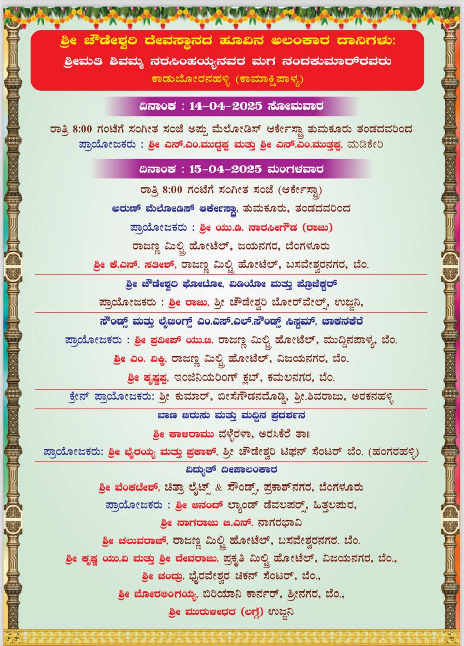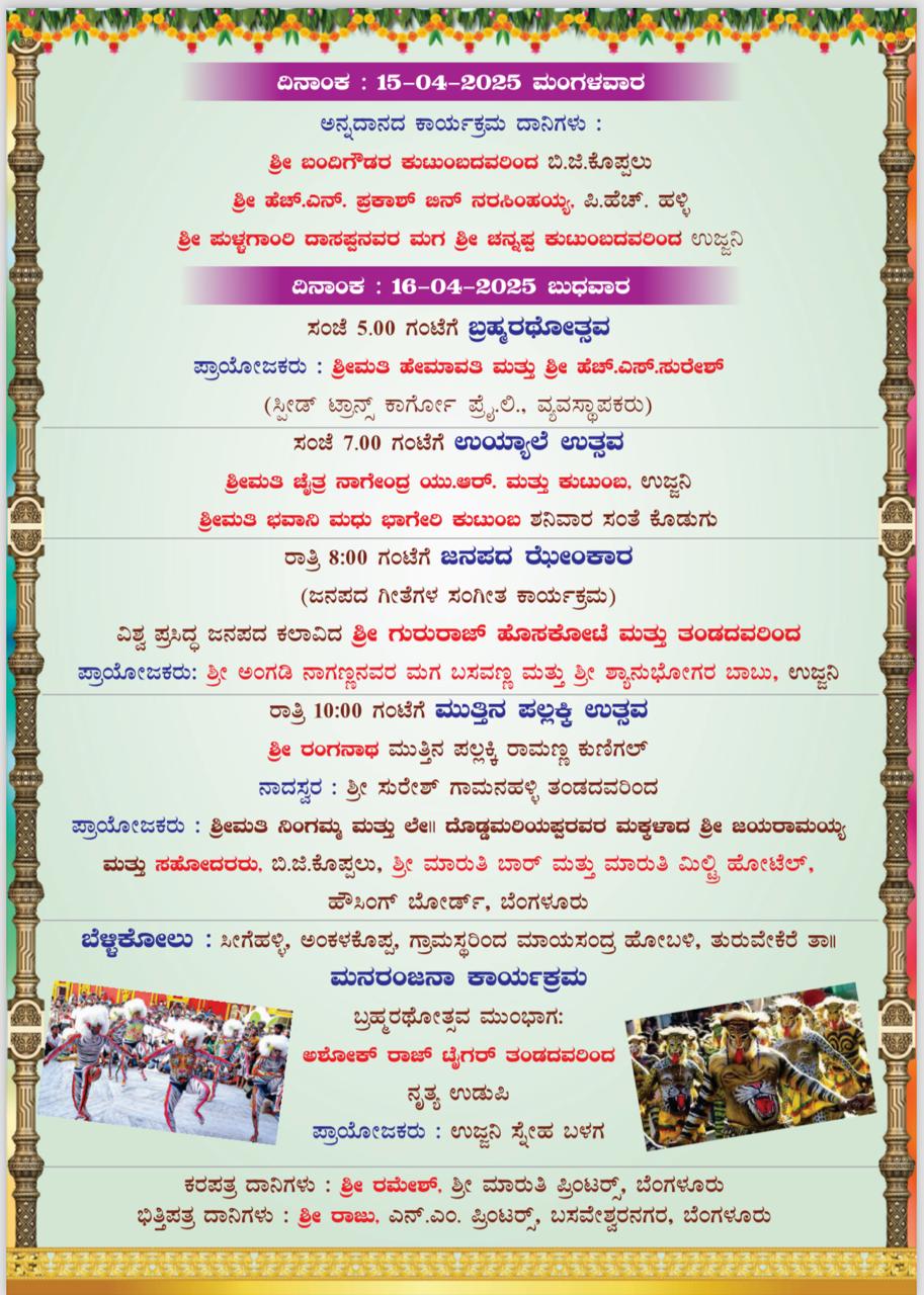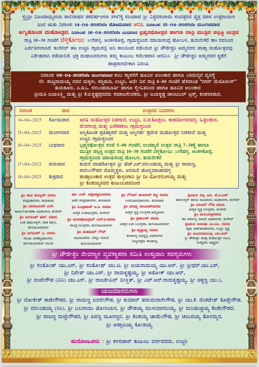ಸ್ವಸ್ತಿಶ್ರೀ ವಿಜಯಾಭ್ಯುದಯ ಶಾಲಿವಾಹನ ಶಕವರ್ಷಂಗಳು 1947ಕ್ಕೆ ಸರಿಯಾದ ಶ್ರೀ ವಿಶ್ವವಸುನಾಮ ಸಂವತ್ಸರದ ಚೈತ್ರ ಮಾಸ ಉತ್ತರಾಯಣ ಶಿಶಿರ ಋತು ಏಪ್ರಿಲ್ 14ರ ಸೋಮವಾರದಂದು ಆರತಿ, ಏಪ್ರಿಲ್ 15ರ ಮಂಗಳವಾರದಂದು ಅಗ್ನಿಕೊಂಡ ಮಹೋತ್ಸವ, ಏಪ್ರಿಲ್ 16ರ ಬುಧವಾರದಂದು ಬ್ರಹ್ಮರಥೋತ್ಸವ ಹಾಗೂ ರಾತ್ರಿ ಮುತ್ತಿನ ಪಲ್ಲಕ್ಕಿ ಉತ್ಸವ ಏರ್ಪಡಿಲಾಗಿದೆ. ಕುಣಿಗಲ್ ತಾಲೂಕಿನ ಉಜ್ಜನಿ ಗ್ರಾಮದಲ್ಲಿ ಆದಿ ಕಾಲದಿಂದ ನಡೆಸಿರುವ ಶ್ರೀ ಚೌಡೇಶ್ವರಿ ಅಮ್ಮನವರ ಜಾತ್ರಾ ಮಹೋತ್ಸವವು ವಿಶೇಷವಾಗಿ ನಡೆಯಲಿದೆ. ಭಕ್ತಮಹಾಜನರುಗಳು ತಮ್ಮ ಕುಟುಂಬ ಸಮೇತರಾಗಿ ಆಗಮಿಸಿ ಶ್ರೀ ಚೌಡೇಶ್ವರಿ ಅಮ್ಮನವರ ಕೃಪೆಗೆ ಪಾತ್ರರಾಗಬೇಕಾಗಿ ವಿನಂತಿಸಲಾಗಿದೆ.
