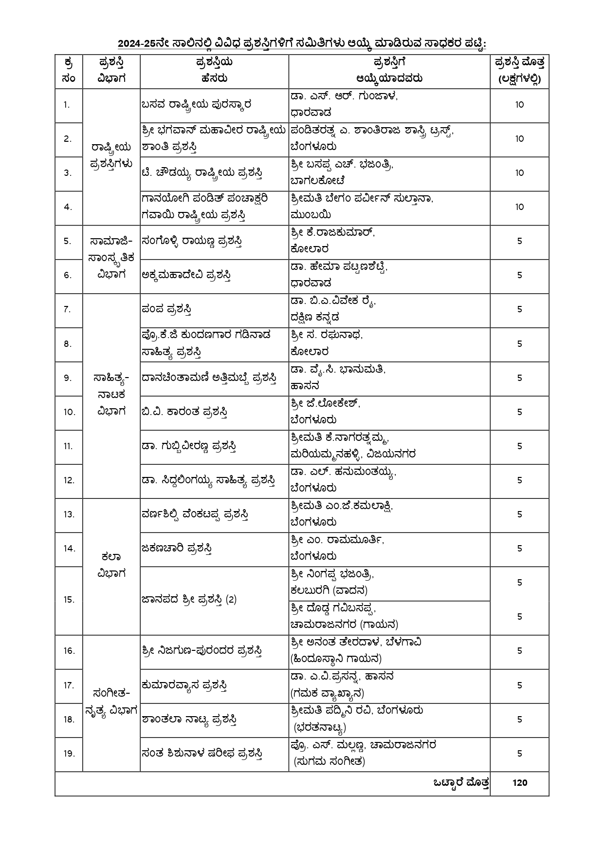 ತಾಜಾ ಸುದ್ದಿ ರಾಜ್ಯ 2024-25ನೇ ಸಾಲಿನ ವಿವಿಧ ಪ್ರಶಸ್ತಿಗಳಿಗೆ ಆಯ್ಕೆಯಾದ ಸಾಧಕರ ಪಟ್ಟಿ ಬಿಡುಗಡೆ ಮಾಡಿದ ಸರ್ಕಾರ bbmp2024 February 13, 2025 ಬೆಂಗಳೂರು: 2024-25ನೇ ಸಾಲಿನ ವಿವಿಧ ಪ್ರಶಸ್ತಿಗಳಿಗೆ ಆಯ್ಕೆಯಾದ ಸಾಧಕರ ಪಟ್ಟಿಯನ್ನು ರಾಜ್ಯ ಸರ್ಕಾರ ಇಂದು ಬಿಡುಗಡೆ ಮಾಡಿದ್ದು, ಸಂಪೂರ್ಣ ಪಟ್ಟಿ ಈ ಕೆಳಕಂಡಂತಿದೆ. ಆರ್ಸಿಬಿ ತಂಡದ ನೂತನ ನಾಯಕನಾಗಿ ರಜತ್ ಪಾಟೀದರ್ ಹೆಸರು ಘೋಷಣೆ Post navigation Previous Previous post: ಆರ್ಸಿಬಿ ತಂಡದ ನೂತನ ನಾಯಕನಾಗಿ ರಜತ್ ಪಾಟೀದರ್ ಹೆಸರು ಘೋಷಣೆNext Next post: ಬಿ ಖಾತಾ ನಿವೇಶನದಾರರಿಗೆ ಬಿಗ್ ಶಾಕ್ ಕೊಟ್ಟ ಬಿಬಿಎಂಪಿ: ಎ ಖಾತಾ ಪ್ರಮಾಣ ಪತ್ರ ರದ್ದು Leave a Reply Cancel replyYour email address will not be published. Required fields are marked *Comment * Name * Email * Website Save my name, email, and website in this browser for the next time I comment. Related News ತಾಜಾ ಸುದ್ದಿ ನಮ್ಮ ಬೆಂಗಳೂರು ರಾಜಕೀಯ ಮಹಿಳಾ ಮೀಸಲಾತಿ ಮಸೂದೆಗೆ ಲೋಕಸಭೆಯಲ್ಲಿ ಸೋಲು; 2/3 ಮತ ಪಡೆಯಲು NDA ವಿಫಲ! Greater Bengaluru News9 April 17, 2026 ತಾಜಾ ಸುದ್ದಿ ರಾಜ್ಯ ಯೋಗೀಶ್ ಗೌಡ ಕೊಲೆ ಪ್ರಕರಣ: ಕಾಂಗ್ರೆಸ್ ಶಾಸಕ ವಿನಯ್ ಕುಲಕರ್ಣಿ ಸೇರಿ 16 ಅಪರಾಧಿಗಳಿಗೆ ಜೀವಾವಧಿ ಶಿಕ್ಷೆ! April 17, 2026