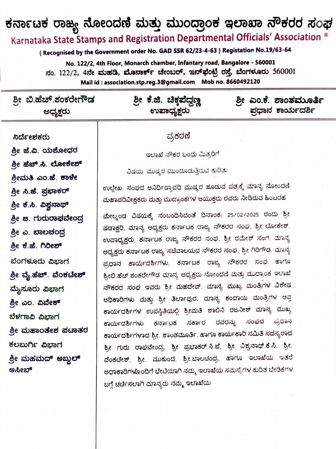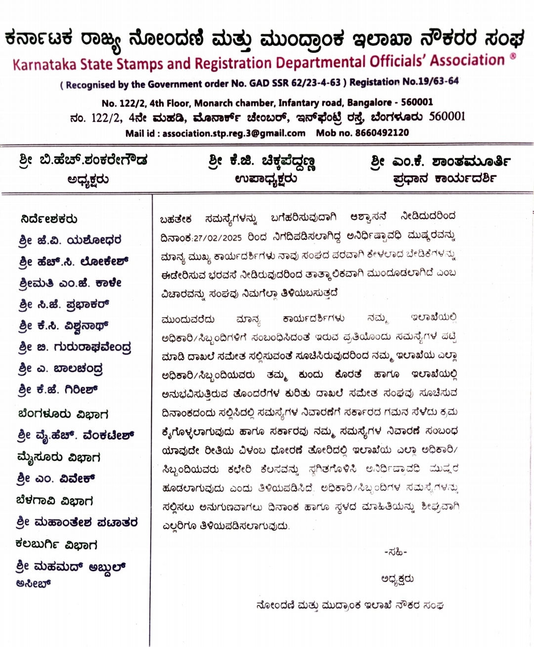 ಕರ್ನಾಟಕ ರಾಜ್ಯ ನೋಂದಣಿ ಮತ್ತು ಮುದ್ರಾಂಕ ಇಲಾಖೆ ನೌಕರರ ಸಂಘದಿಂದ ಮುಷ್ಕರಕ್ಕೆ ಕರೆ ನೀಡಲಾಗಿತ್ತು. ಆಸ್ತಿ ದಸ್ತಾವೇಜು ನೋಂದಣಿ ಸೇರಿ ಎಲ್ಲಾ ಸೇವೆಗಳನ್ನು ಬಹಿಷ್ಕರಿಸಿ ಅನಿರ್ದಿಷ್ಟಾವಧಿ ಮುಷ್ಕರ ಹೂಡಲು ನಿರ್ಧಾರ ಮಾಡಲಾಗಿತ್ತು. ಆದರೆ, ಮುಷ್ಕರ ಮುಂದೂಡಿರುವುದರಿಂದ ಎಂದಿನಂತೆ ಎಲ್ಲ ಸೇವೆಗಳು ಇರಲಿವೆ.
