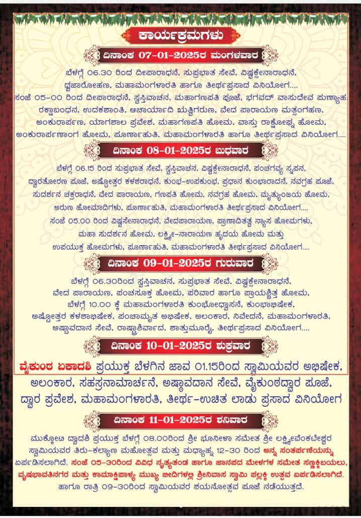 ವೈಕುಂಠ ಏಕಾದಶಿ ಪ್ರಯುಕ್ತ ಬೆಳಗಿನ ಜಾವ 01.15ರಿಂದ ಸ್ವಾಮಿಯವರ ಅಭಿಷೇಕ, ಅಲಂಕಾರ, ಸಹಸ್ರನಾಮಾರ್ಚನೆ, ಅಷ್ಠಾವದಾನ ಸೇವೆ, ವೈಕುಂಠದ್ವಾರ ಪೂಜೆ, ದ್ವಾರ ಪ್ರವೇಶ, ಮಹಾಮಂಗಳಾರತಿ, ತೀರ್ಥ-ಉಚಿತ ಲಾಡು ಪ್ರಸಾದ ವಿನಿಯೋಗ