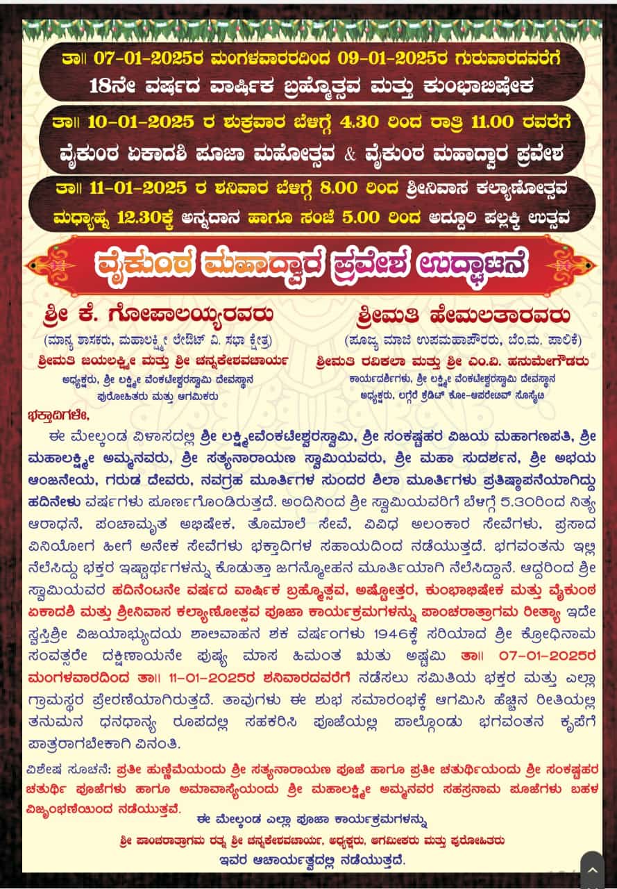 ಶ್ರೀ ಲಕ್ಷ್ಮೀವೆಂಕಟೇಶ್ವರಸ್ವಾಮಿ, ಶ್ರೀ ಸಂಕಷ್ಟಹರ ವಿಜಯ ಮಹಾಗಣಪತಿ, ಶ್ರೀ ಮಹಾಲಕ್ಷ್ಮೀ ಅಮ್ಮನವರು, ಶ್ರೀ ಸತ್ಯನಾರಾಯಣ ಸ್ವಾಮಿಯವರು, ಶ್ರೀ ಮಹಾ ಸುದರ್ಶನ, ಶ್ರೀ ಅಭಯ ಆಂಜನೇಯ, ಗರುಡ ದೇವರು, ನವಗ್ರಹ ಮೂರ್ತಿಗಳ ಸುಂದರ ಶಿಲಾ ಮೂರ್ತಿಗಳು ಪ್ರತಿಷ್ಠಾಪನೆಯಾಗಿದ್ದು ಹದಿನೇಳು ವರ್ಷಗಳು ಪೂರ್ಣಗೊಂಡಿರುತ್ತದೆ. ಅಂದಿನಿಂದ ಶ್ರೀ ಸ್ವಾಮಿಯವರಿಗೆ ಬೆಳಗ್ಗೆ 5.30ರಿಂದ ನಿತ್ಯ ಆರಾಧನೆ, ಪಂಚಾಮೃತ ಅಭಿಷೇಕ, ತೊಮಾಲೆ ಸೇವೆ, ವಿವಿಧ ಅಲಂಕಾರ ಸೇವೆಗಳು, ಪ್ರಸಾದ ವಿನಿಯೋಗ ಹೀಗೆ ಅನೇಕ ಸೇವೆಗಳು ಭಕ್ತಾದಿಗಳ ಸಹಾಯದಿಂದ ನಡೆಯುತ್ತದೆ. ಭಗವಂತನು ಇಲ್ಲಿ ನೆಲೆಸಿದ್ದು ಭಕ್ತರ ಇಷ್ಟಾರ್ಥಗಳನ್ನು ಕೊಡುತ್ತಾ ಜಗಮ್ಮೋಹನ ಮೂರ್ತಿಯಾಗಿ ನೆಲೆಸಿದ್ದಾನೆ. ಆದ್ದರಿಂದ ಶ್ರೀ ಸ್ವಾಮಿಯವರ ಹದಿನೆಂಟನೇ ವರ್ಷದ ವಾರ್ಷಿಕ ಬ್ರಹೊತ್ಸವ, ಅಷ್ಟೋತ್ತರ, ಕುಂಭಾಭಿಷೇಕ ಮತ್ತು ವೈಕುಂಠ ಏಕಾದಶಿ ಮತ್ತು ಶ್ರೀನಿವಾಸ ಕಲ್ಯಾಣೋತ್ಸವ ಪೂಜಾ ಕಾರ್ಯಕ್ರಮಗಳನ್ನು ಪಾಂಚರಾತ್ರಾಗಮ ರೀತ್ಯಾ ಇದೇ ಸ್ವಸ್ತಿಶ್ರೀ ವಿಜಯಾಭ್ಯುದಯ ಶಾಲಿವಾಹನ ಶಕ ವರ್ಷಂಗಳು 1946ಕ್ಕೆ ಸರಿಯಾದ ಶ್ರೀ ಕ್ರೋಧಿನಾಮ ಸಂವತ್ಸರೇ ದಕ್ಷಿಣಾಯನೇ ಪುಷ್ಯ ಮಾಸ ಹಿಮಂತ ಋತು ಅಷ್ಟಮಿ ತಾ|| 07-01-2025ರ ಮಂಗಳವಾರದಿಂದ ತಾ|| 11-01-2025ರ ಶನಿವಾರದವರೆಗೆ ನಡೆಸಲು ಸಮಿತಿಯ ಭಕ್ತರ ಮತ್ತು ಎಲ್ಲಾ ಗ್ರಾಮಸ್ಥರ ಪ್ರೇರಣೆಯಾಗಿರುತ್ತದೆ. ತಾವುಗಳು ಈ ಶುಭ ಸಮಾರಂಭಕ್ಕೆ ಆಗಮಿಸಿ ಹೆಚ್ಚಿನ ರೀತಿಯಲ್ಲಿ ತನುಮನ ಧನಧಾನ್ಯ ರೂಪದಲ್ಲಿ ಸಹಕರಿಸಿ ಪೂಜೆಯಲ್ಲಿ ಪಾಲ್ಗೊಂಡು ಭಗವಂತನ ಕೃಪೆಗೆ ಪಾತ್ರರಾಗಬೇಕಾಗಿ ವಿನಂತಿಸಲಾಗಿದೆ.