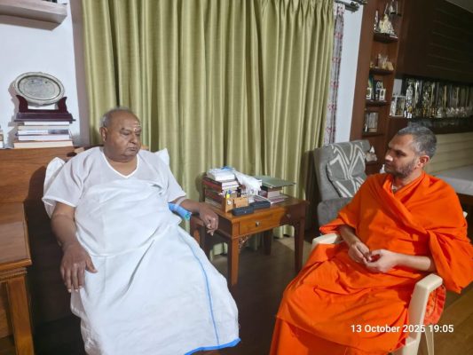 ಇಂದು (ಅ. 13) ಸಂಜೆ ದೇವೇಗೌಡರ ನಿವಾಸಕ್ಕೆ ಭೇಟಿ ನೀಡಿದ ನಂಜಾವಧೂತ ಶ್ರೀಗಳು ಕೆಲ ಸಮಯದವರೆಗೆ ಹೆಚ್.ಡಿ. ದೇವೇಗೌಡರ ಜೊತೆ ಮಾತನಾಡಿ, ಆರೋಗ್ಯ ವಿಚಾರಿಸಿದರು. ಇದೇ ವೇಳೆ ಅವರಿಗೆ ಆಶೀರ್ವಾದಿಸಿದರು.