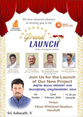 ಬೆಂಗಳೂರು: ಇದೇ ಫೆಬ್ರವರಿ 22ರಂದು ಹಾರೋಹಳ್ಳಿಯಲ್ಲಿರುವ ಲಕ್ಷ್ ಪ್ರಾಪರ್ಟೀಸ್ ಅವರ ವಿಕಾಸ್ ವೈಟ್ ಲ್ಯಾಂಡ್ ಮೆಡೋಸ್ ಅವರ ಲಕ್ಷುರಿ ಫ್ಲ್ಯಾಟ್ಗಳ ಉದ್ಘಾಟನಾ ಸಮಾರಂಭ ನಡೆಯಲಿದ್ದು, ಸರ್ವರು ಆಗಮಿಸಬೇಕೆಂದು ಮನಪೂರ್ವಕವಾಗಿ ಕೋರುತ್ತಿದ್ದೇವೆ.